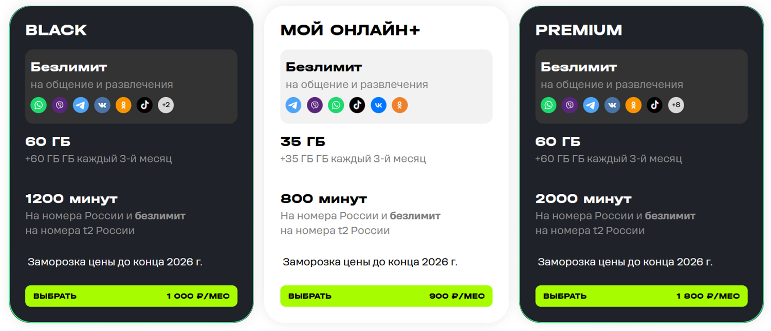 Помимо этого, тариф предполагает большой пакет интернет-трафика, обслуживание по выделенной линии и уже привычный безлимит в кругу своих, то есть внутри сети t2. Только на этом тарифе есть безлимитный просмотр YouTube. По соотношению абонентской платы и набора услуг — один из лучших вариантов для тех регионов, в которых есть покрытие t2.