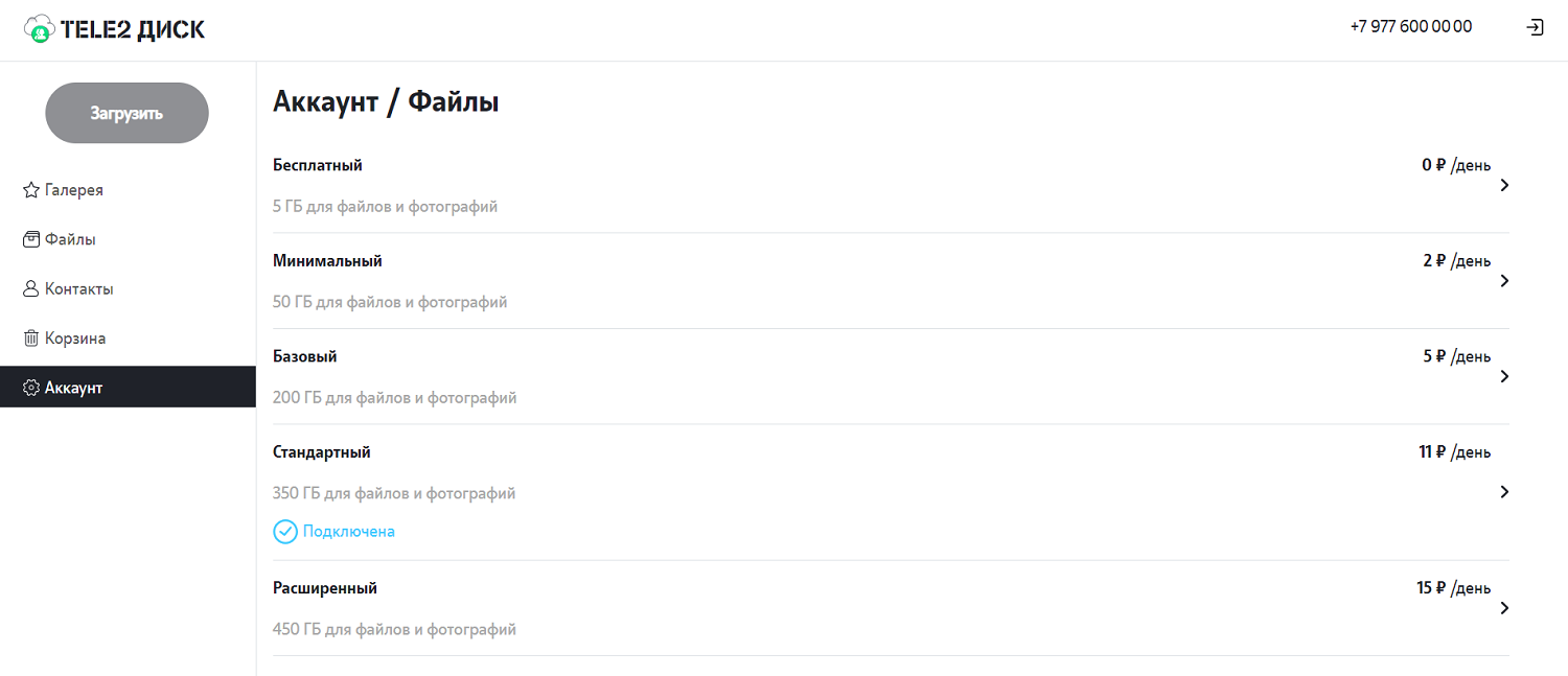 Для файлов и фотографий выбор вариантов подписки на “Tele2 Диск” гораздо шире: